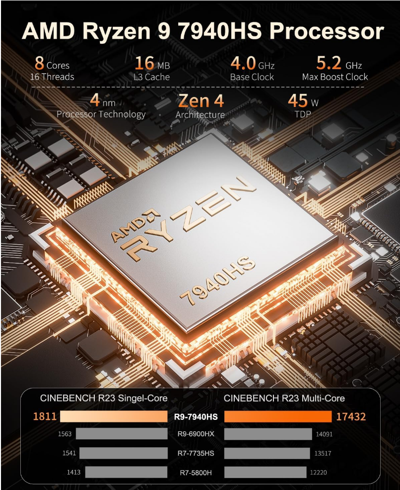 | CPU | AMD Ryzen 9 7940HS Zen4 with 8 cores and 16 threads, 16MB cache, clocking between 4.0 GHz and 5.2 GHz, with a TDP ranging from 35W to 54W, and built on a 4 nm process, offering up to 30% performance boost compared to the Ryzen 7 7735HS |