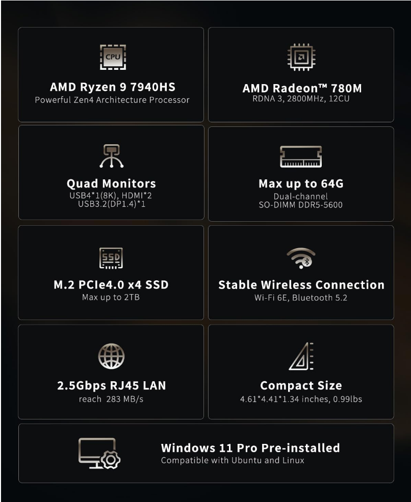The unit I was sent has the AMD Ryzen 9 7940HS Zen4 with 8 cores and 16 threads, 16MB cache, clocking between 4.0 GHz and 5.2 GHz. This is an excellent CPU for home lab, offering uniform cores and 16 threads to work with. You won’t have the issues of working with the “hybrid” type architectures with performance and efficiency cores.