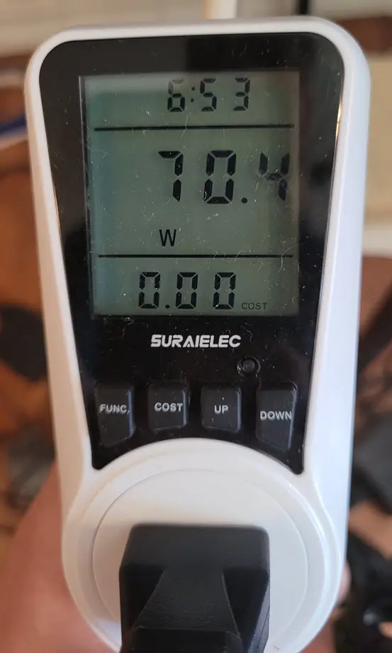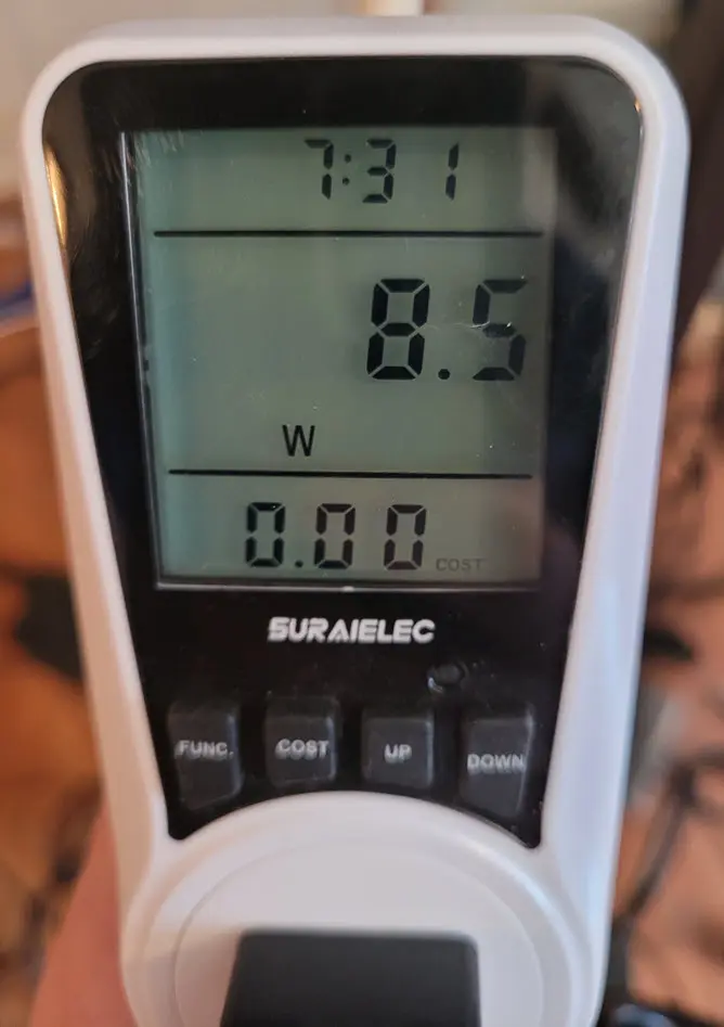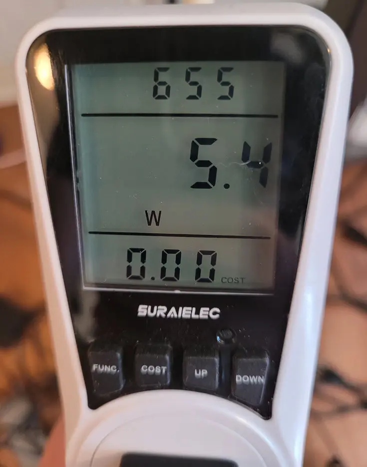 Let’s talk about power consumption. This little mini PC shines on that front. Below is a look at the power draw with the mini PC idling without running any VMs.