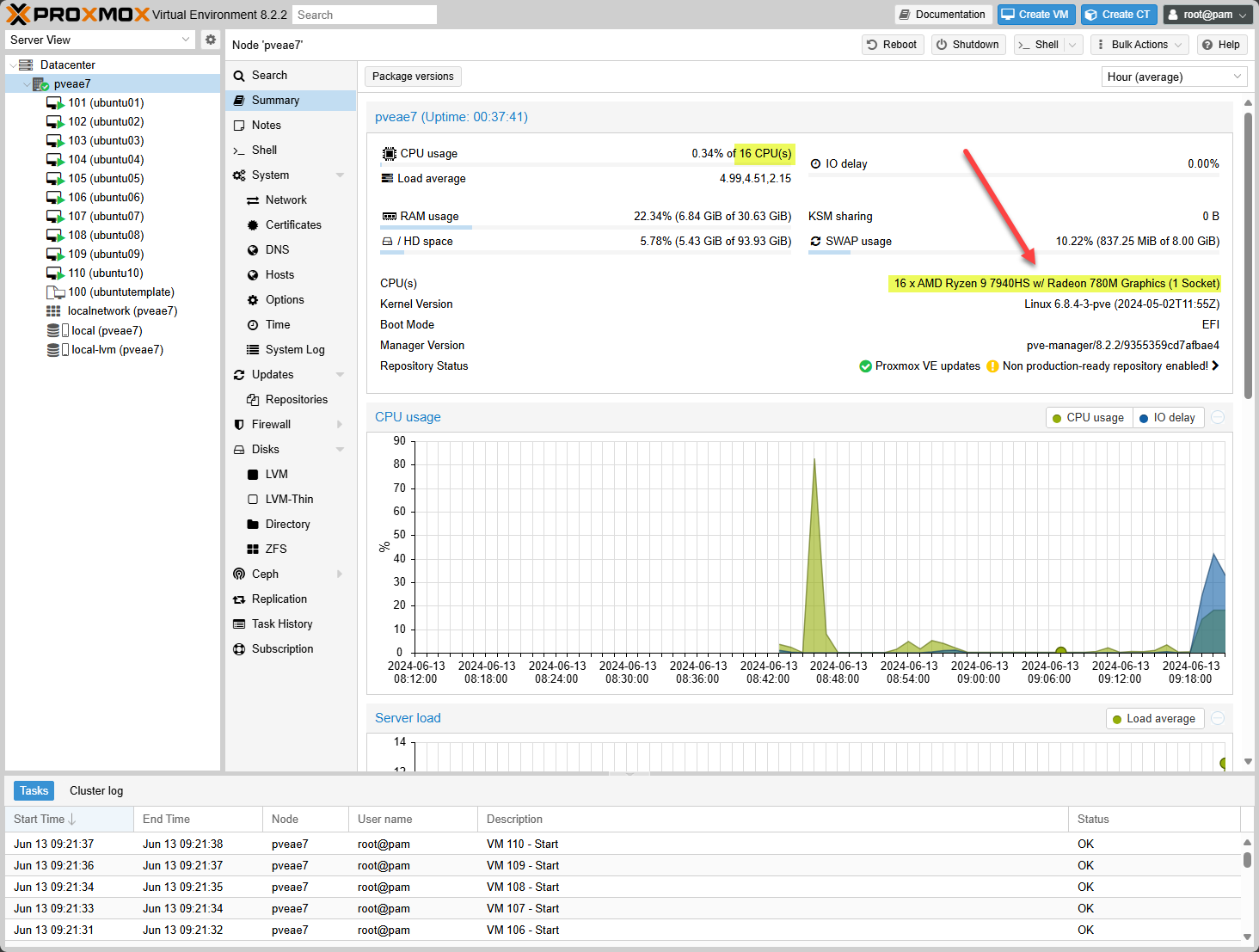 Below is running Proxmox with a few VMs on the Geekom AE7.