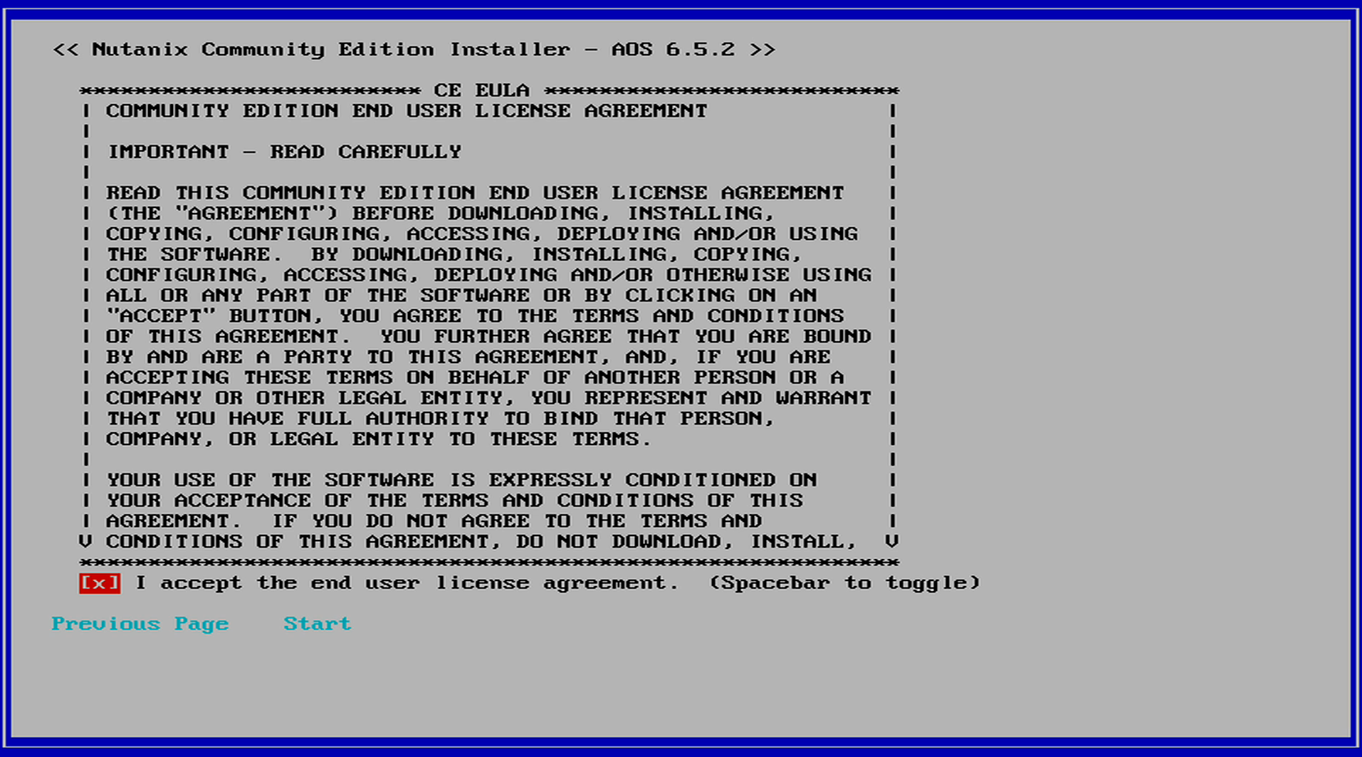 Agree to the Nutanix Community Edition EULA. You will need to page down on this screen through the EULA.