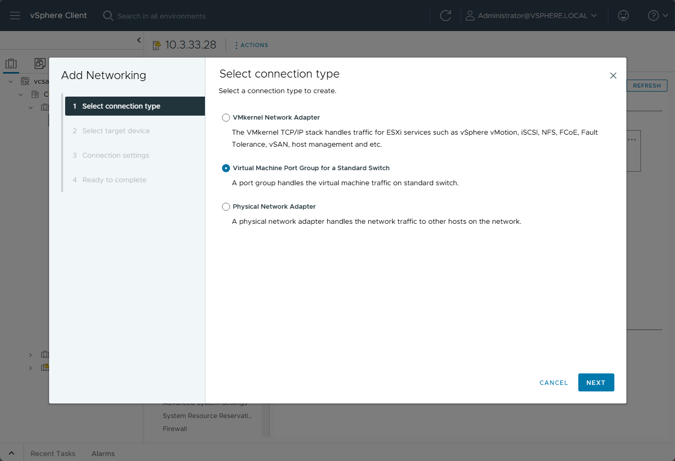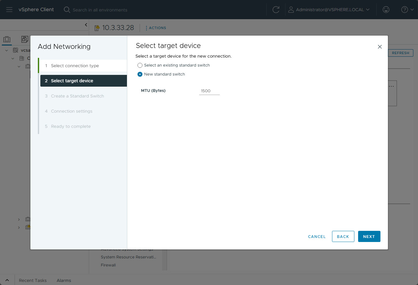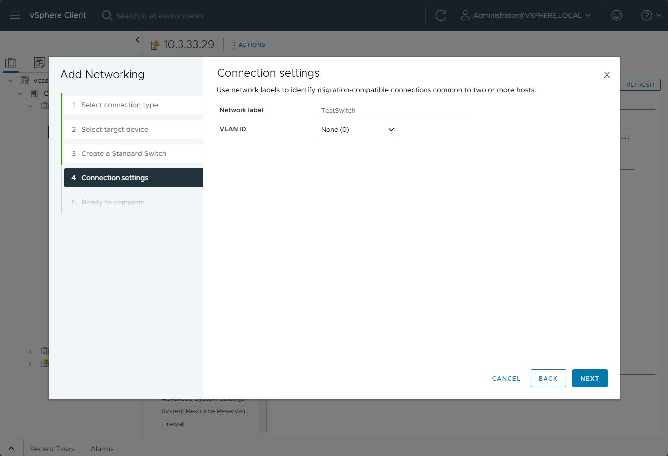 To create a new standard virtual switch in VMware, navigate to Networking > Virtual Switches > Add networking in the vSphere Client and log in with your administrator account.