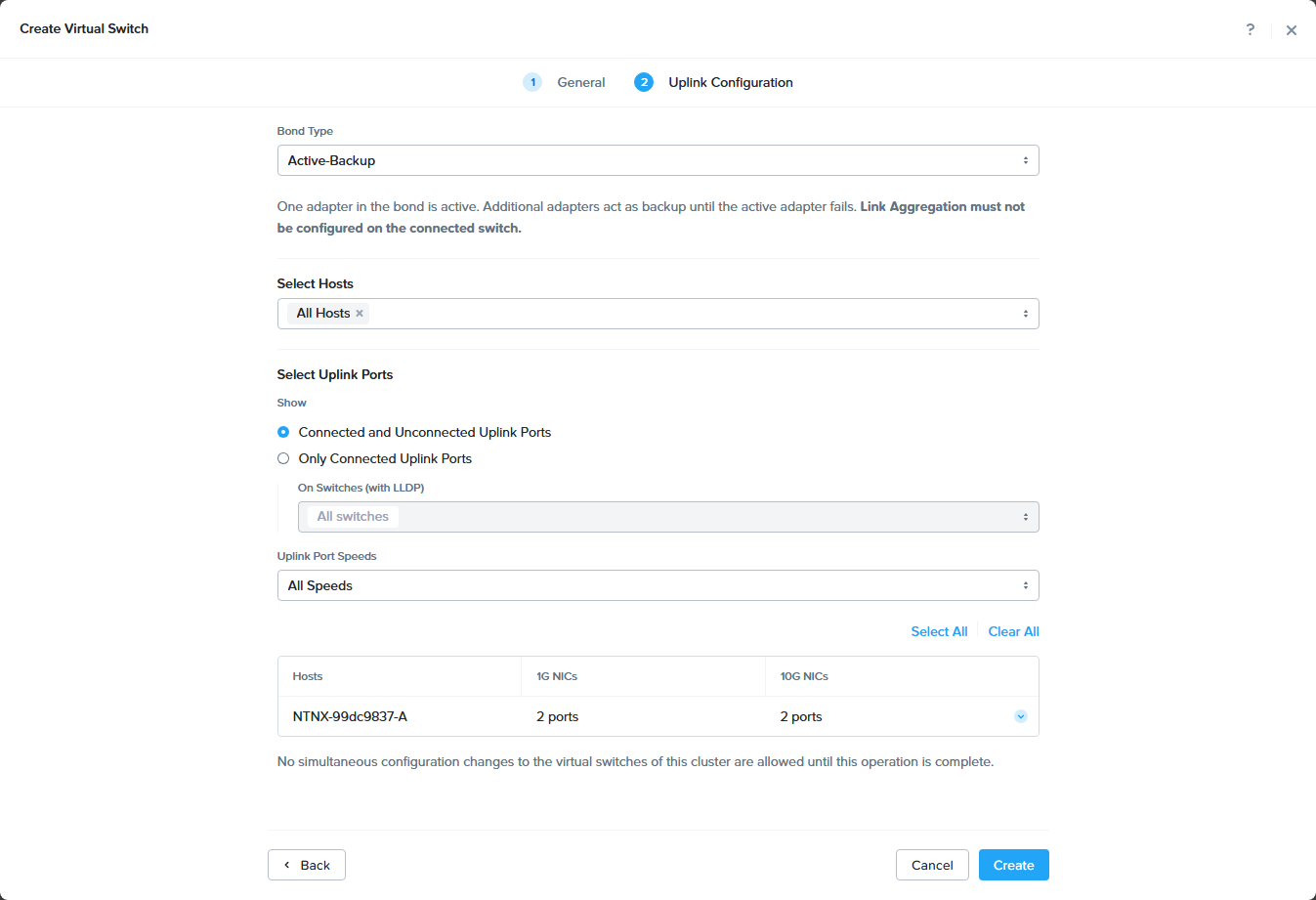In my configuration, I can’t add a new virtual switch in Nutanix since I have the adapters assigned to the first bridge. However, after you hit Create, the new virtual switch will be created.