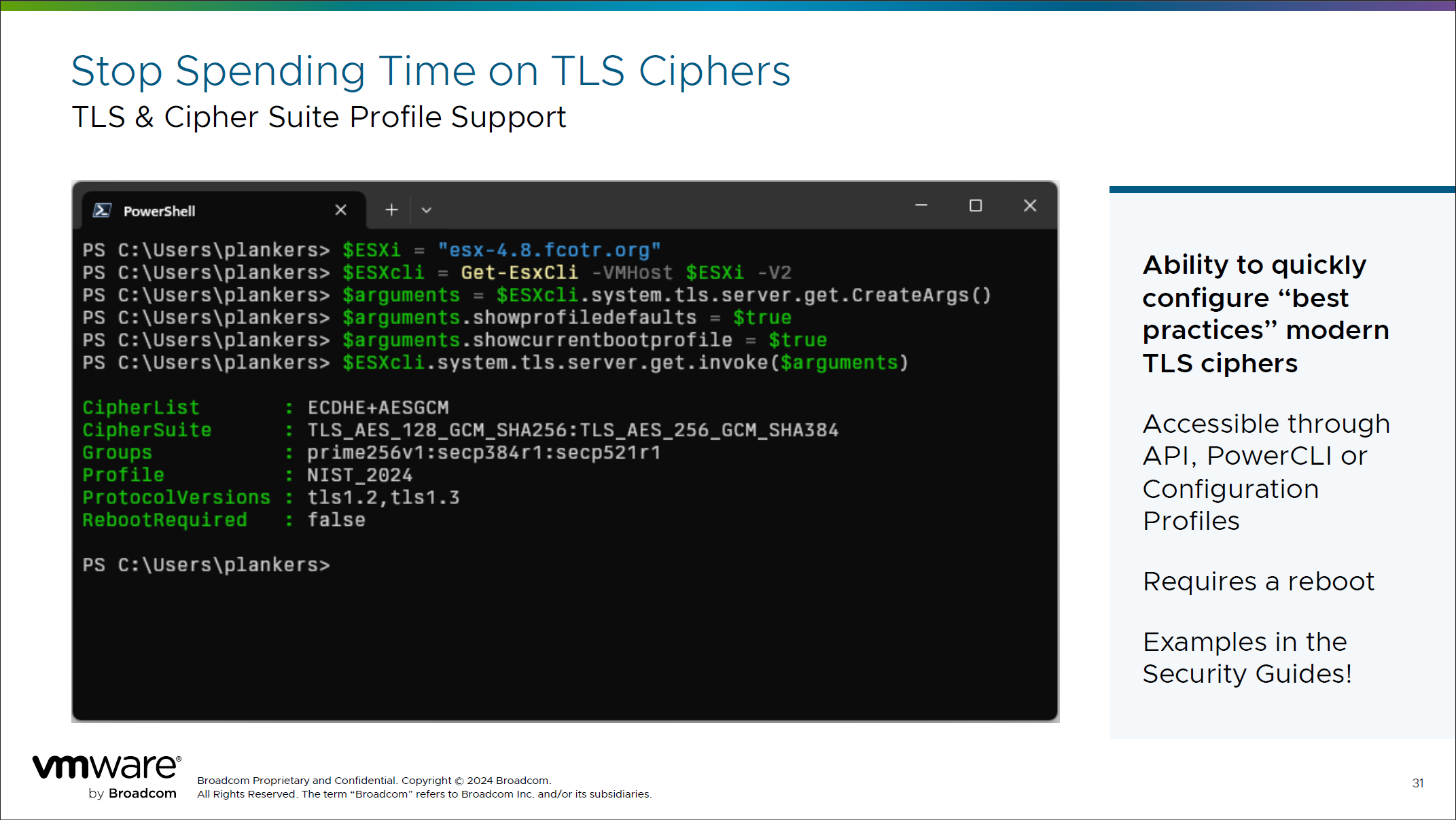 This update includes the ability to quickly configure and implement modern “best practices” for TLS ciphers directly through the vSphere API, PowerCLI, or configuration profiles. These enhancements help secure data in transit and make sure that communication between components uses the latest security standards. A system reboot is required to apply these changes, ensuring all components cleanly transition to the new security configurations.
