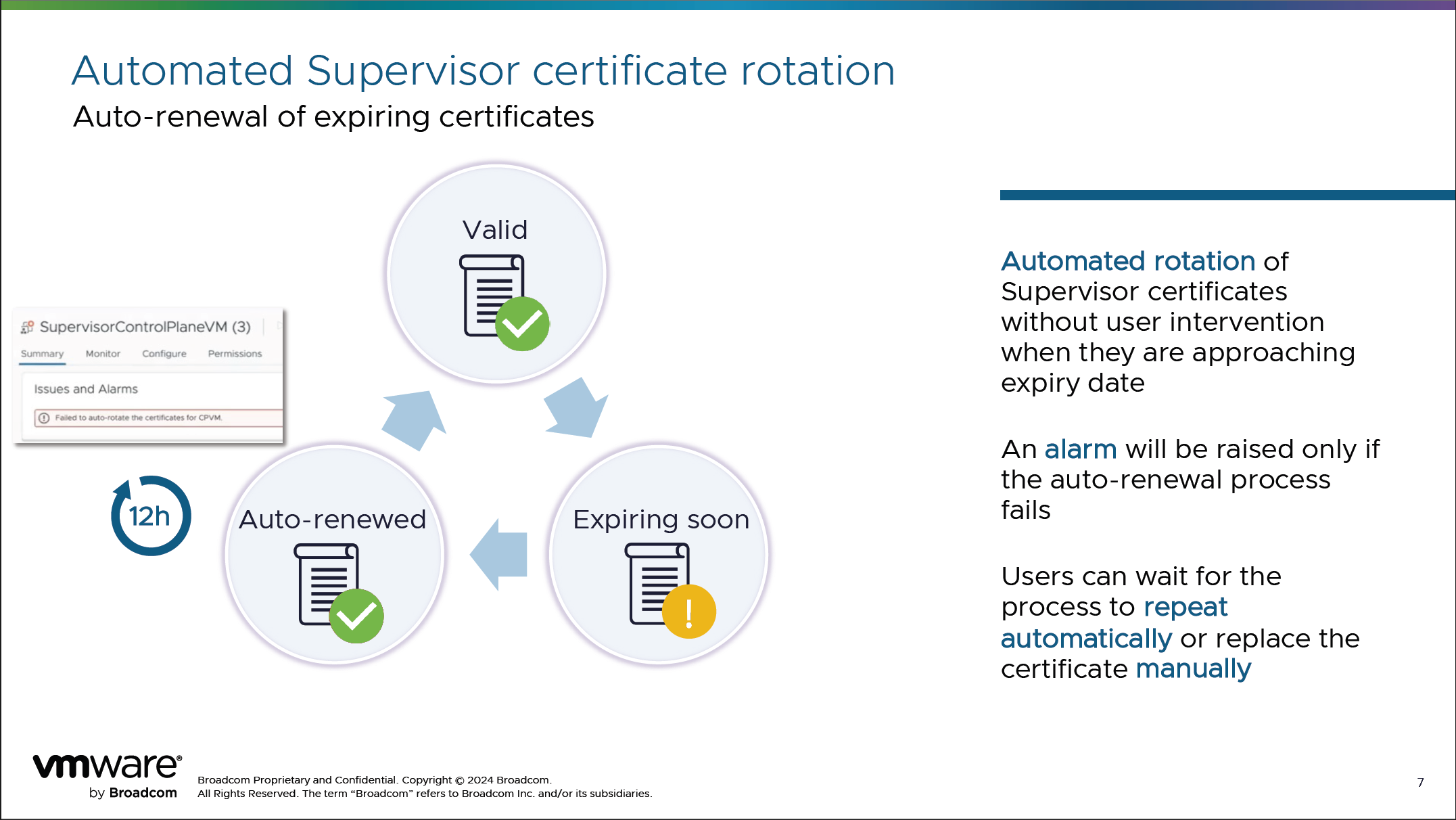 vSphere now automates the rotation of expiring Supervisor certificates, which can be a pain to have to rotate manually. It helps reduce the manual steps needed before rotation and enhances security. This feature also has an alarm that alerts administrators only if the auto-renewal process fails.