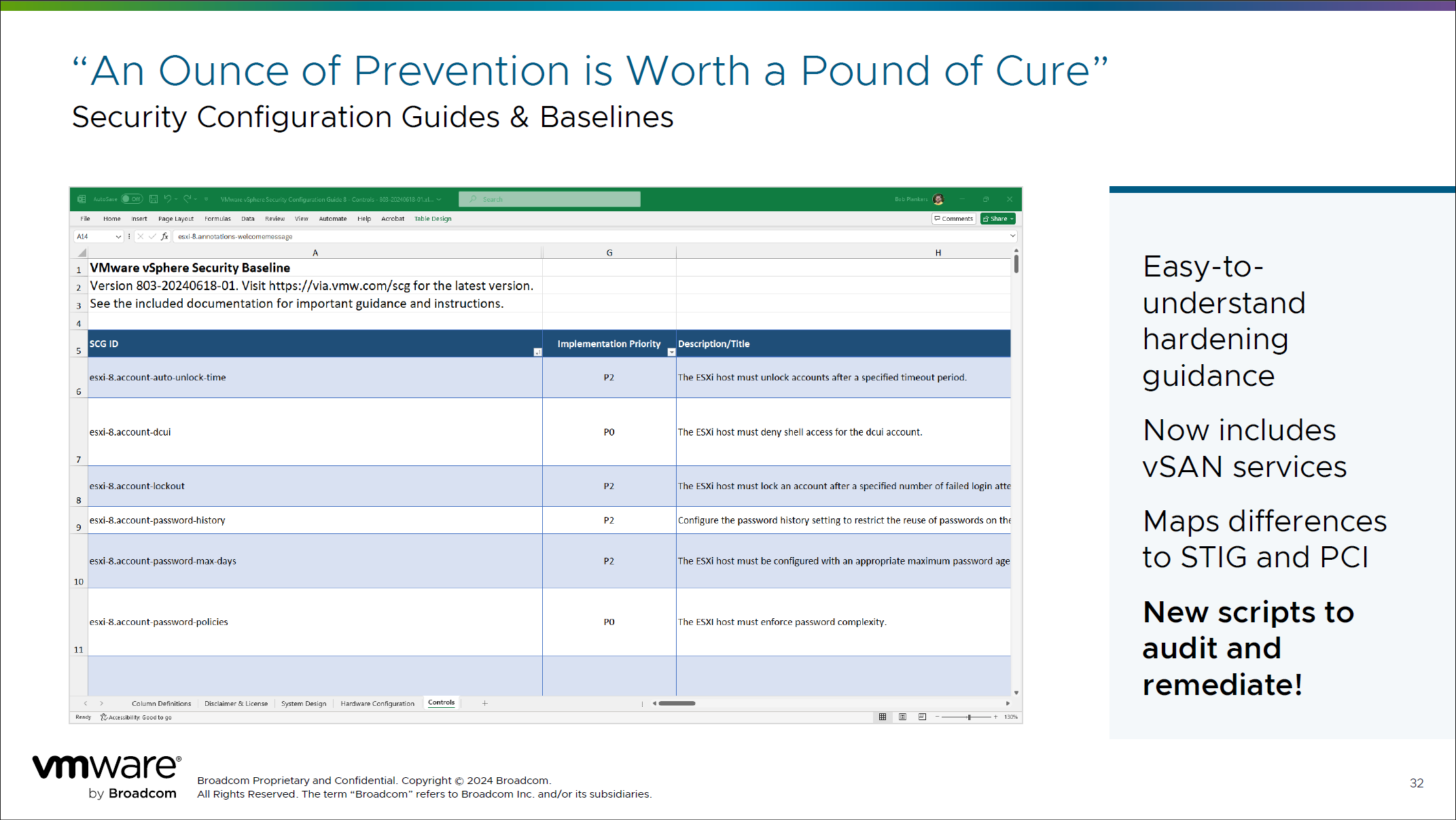 vSphere 8 Update 3 comes with updated security configuration guides and baselines that are easier to understand and implement. These guides now include coverage for vSAN services and map out differences between the Security Technical Implementation Guides (STIG) and Payment Card Industry (PCI) compliance requirements. Also, you have new scripts that are provided to help audit and remediate configurations.
