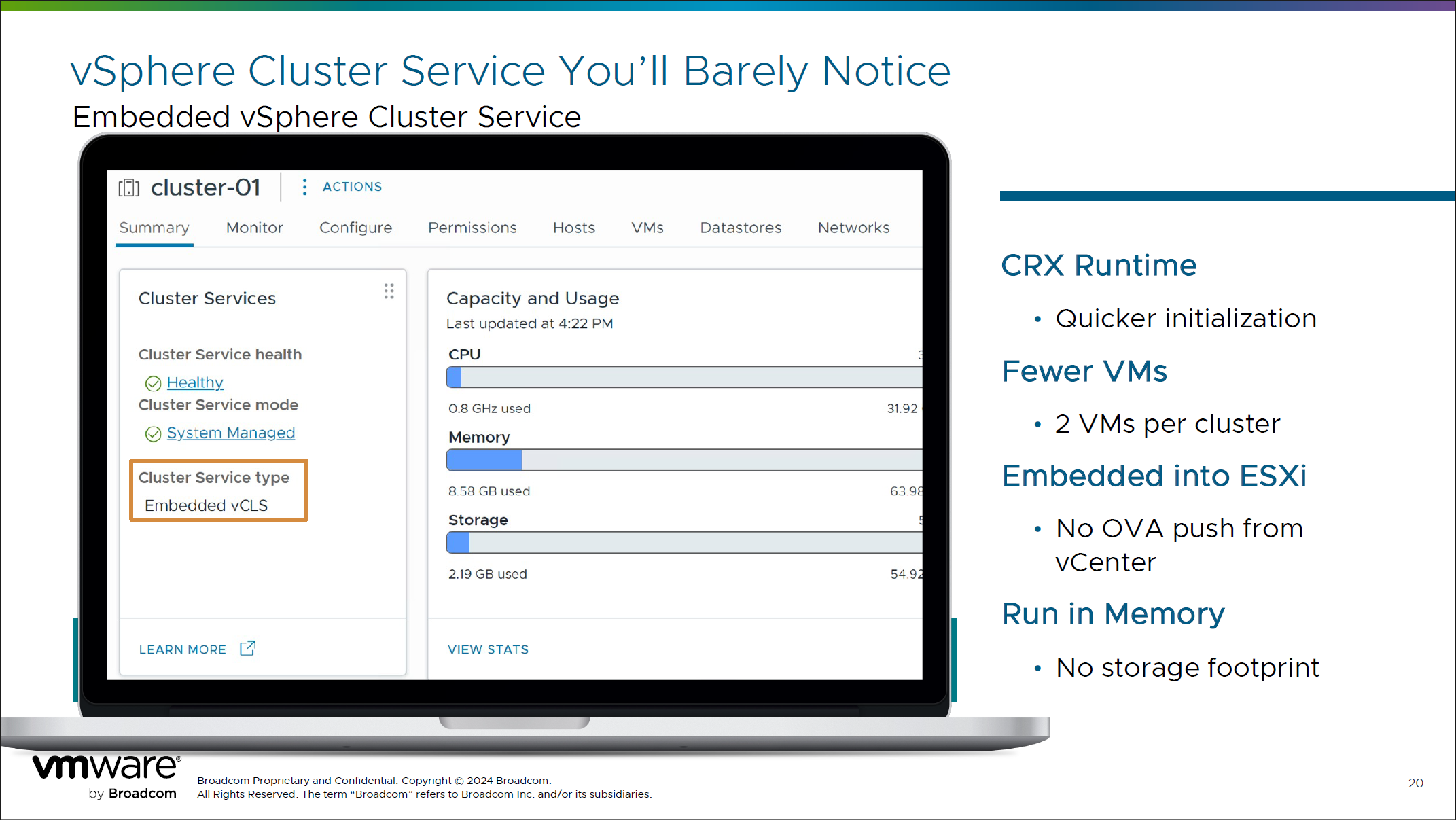 New with vSphere 8.0 Update 3 is a vSphere Cluster Service that is embedded in ESXi itself. There will now be fewer VMs to run. You will only see 2 VMs per cluster, if the cluster is a two-node cluster or a 64-node cluster, there will only be 2.