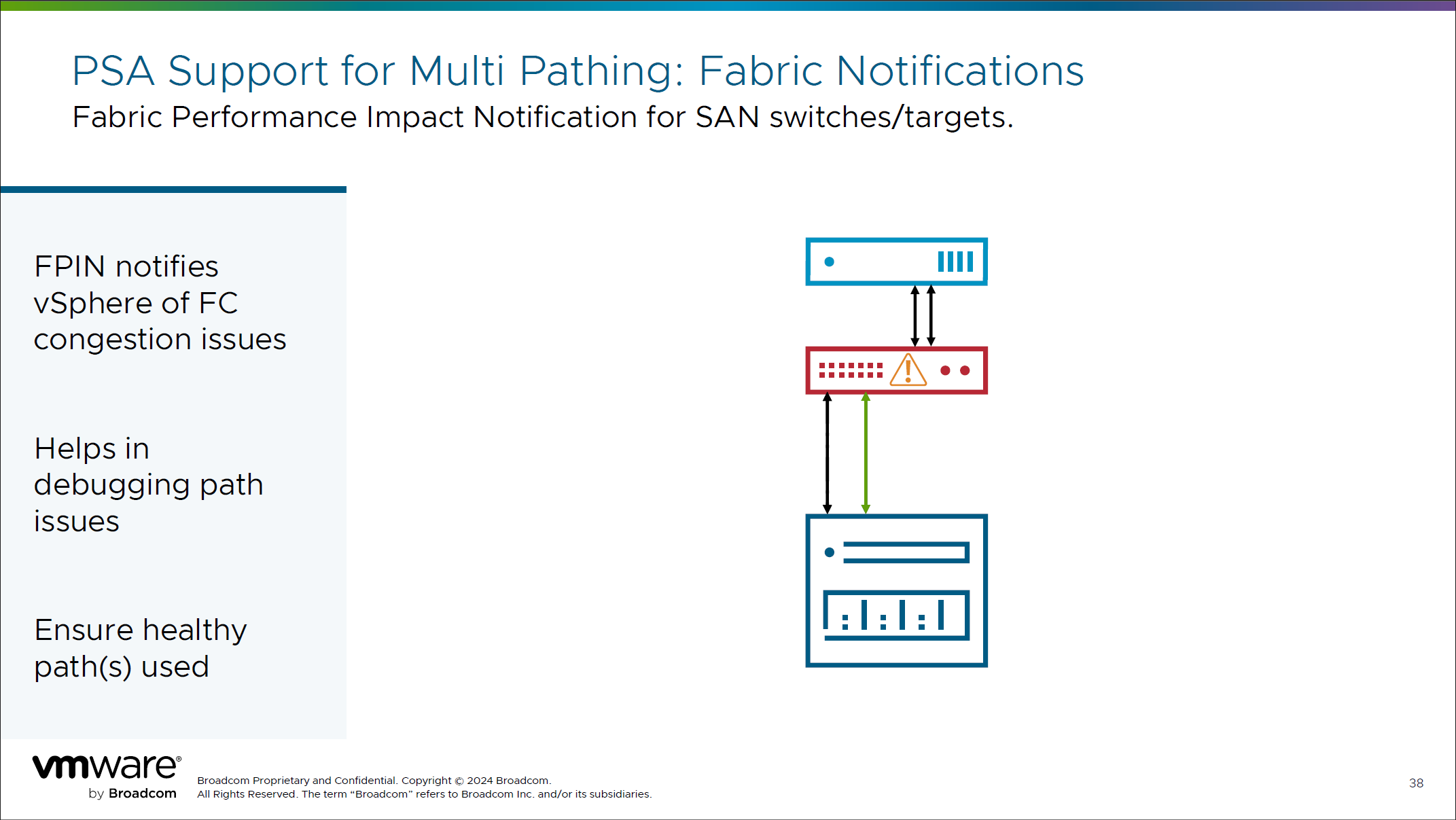 Path Selection Plugin (PSA) enhancements include support for Fabric Performance Impact Notification (FPIN). It informs vSphere about congestion issues on Fibre Channel networks. This capability helps to troubleshoot path issues and make sure that the healthiest available paths are used for data storage operations.