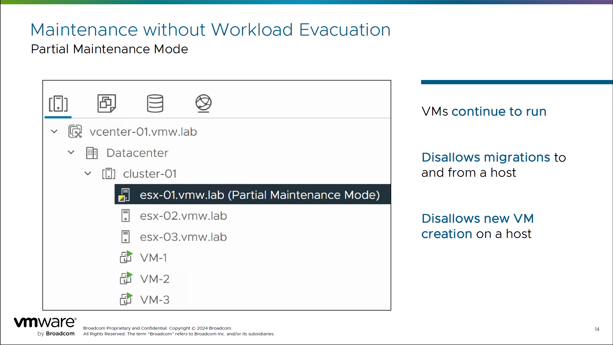 The partial maintenance mode is a major new feature that allows VMs to continue running while disallowing migrations to and from the host and new VM creations on it. This capability can help during updates and patches to make sure of continuous availability and that services remain online.