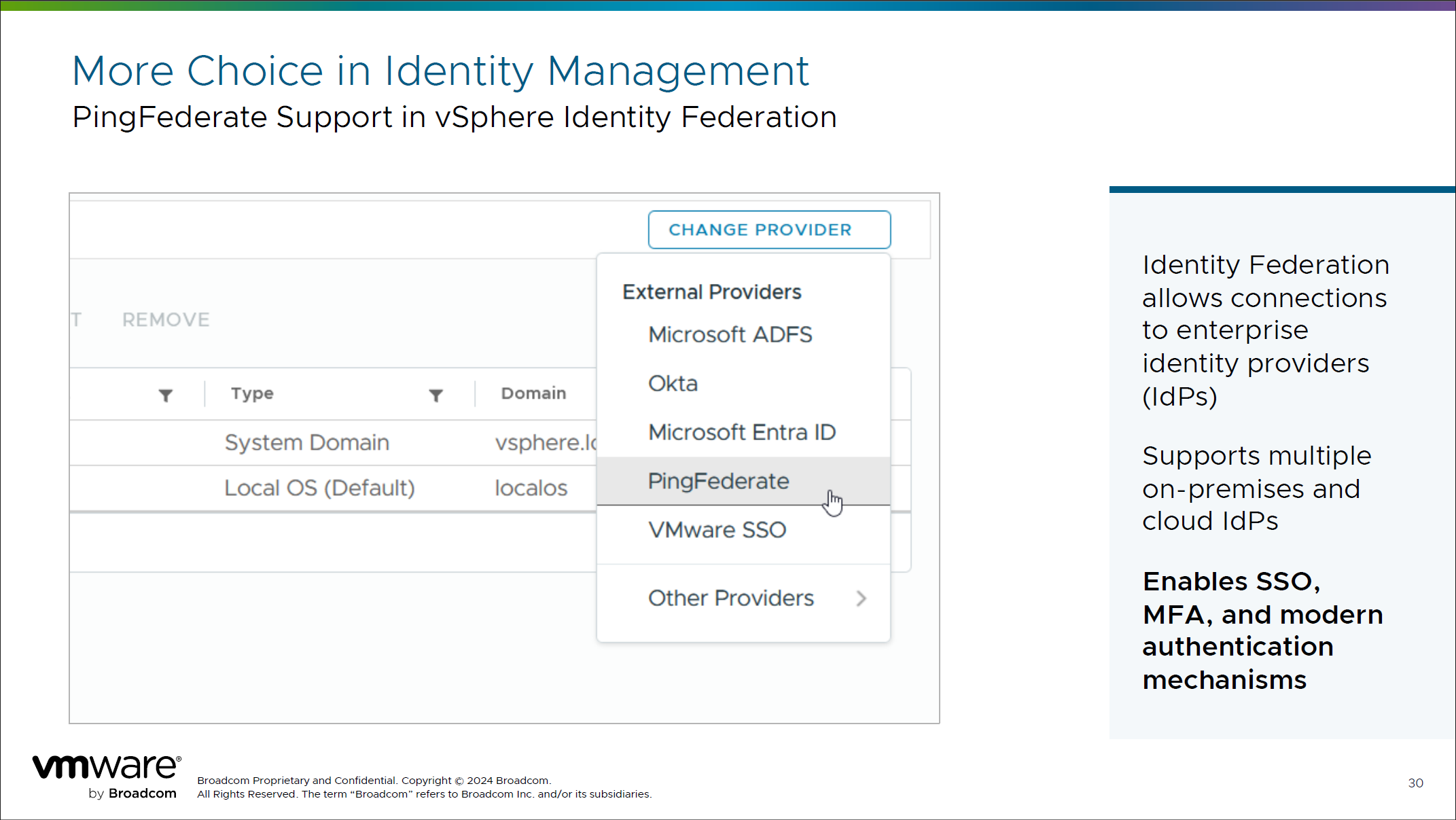 vSphere 8 Update 3 introduces support for PingFederate. This helps to expand the choices with the Identity Federation capabilities. The Identity Federation allows vSphere to connect with multiple on-premises and cloud-based identity providers (IdPs). It helps integrate a more flexible and secure Single Sign-On (SSO) experience. It supports modern authentication protocols, including Multi-Factor Authentication (MFA). This helps to make sure your vSphere environment aligns with the security posture against unauthorized access.