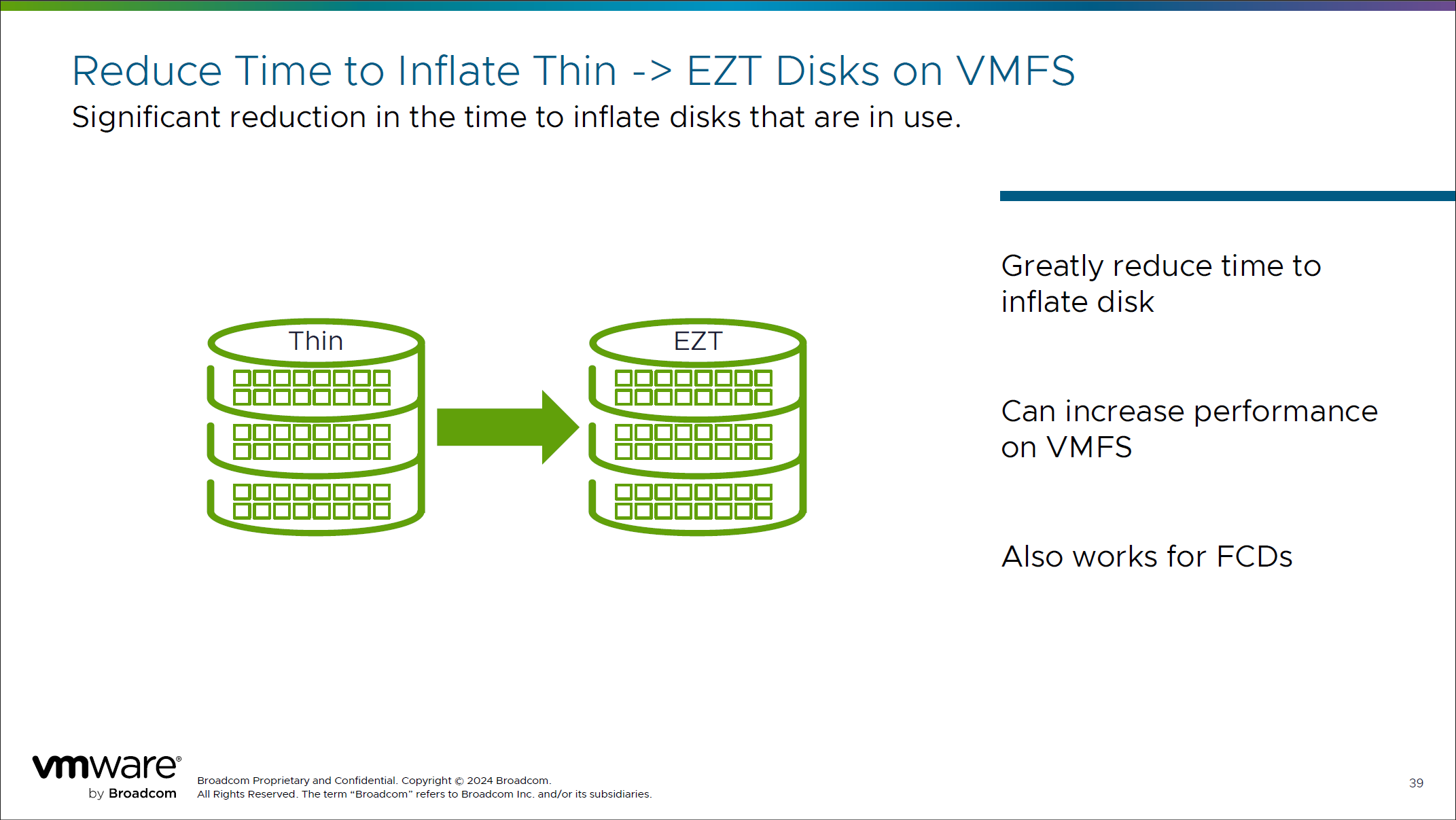 The process of inflating thin-provisioned disks to eager zeroed thick (EZT) has been majorly optimized. This enhancement reduces the time required for these operations. It also boosts performance on VMFS datastores in environments where disk format conversions are common due to changing performance or security requirements.