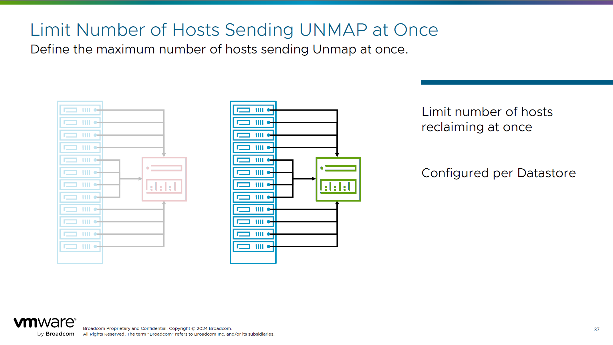 To prevent performance degradation during extensive UNMAP operations, vSphere 8 Update 3 allows administrators to define the maximum number of hosts that can send UNMAP commands at the same time. This is configurable per datastore and helps to make sure you always have optimal performance even during large-scale space reclamation tasks.
