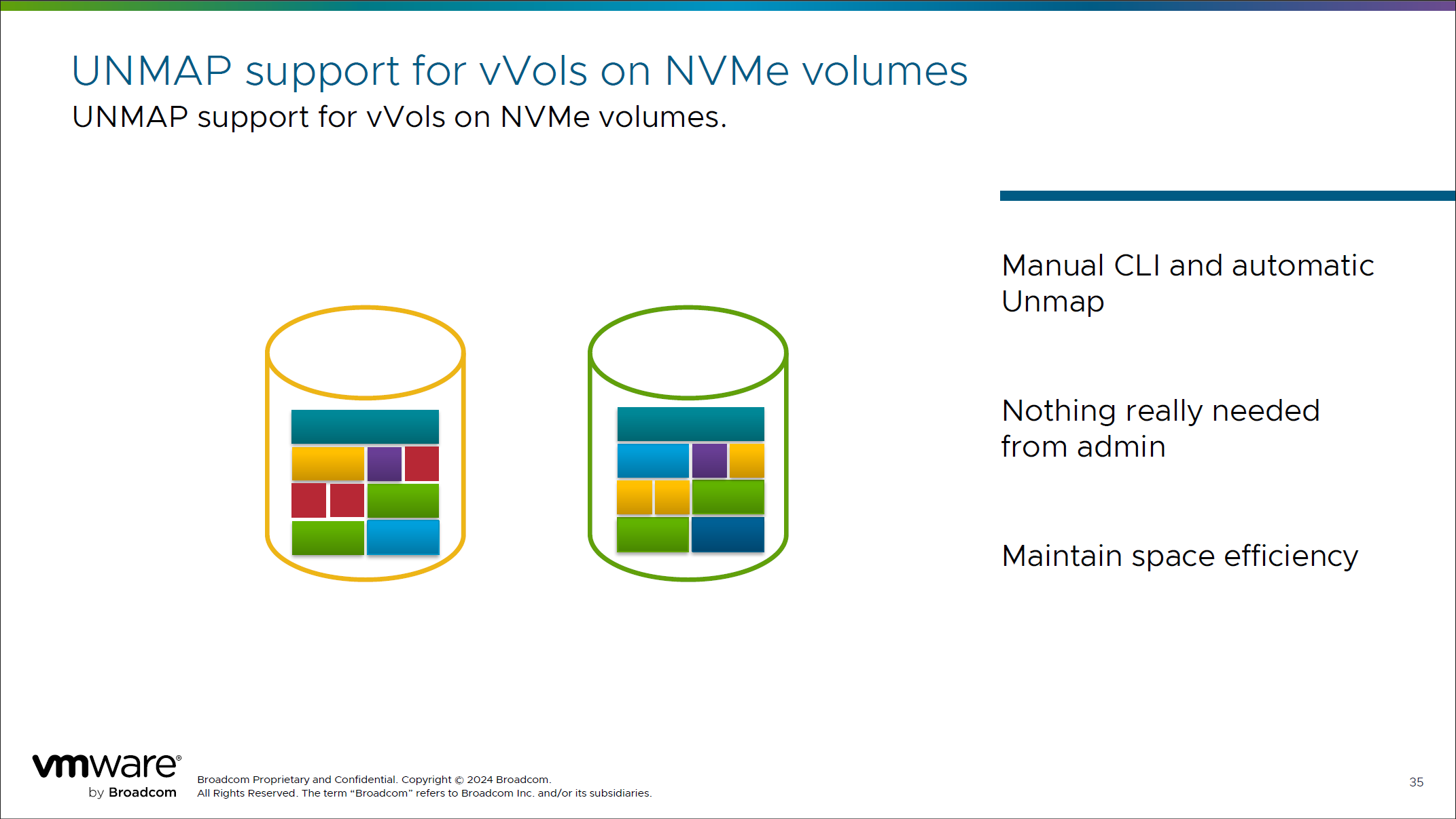 UNMAP command support has been added for vVols on NVMe volume. This process allows for space reclamation in the background without administrative intervention. It helps maintain storage efficiency and automatically optimizes space usage, which is particularly beneficial in dynamic environments where demands are changing often.