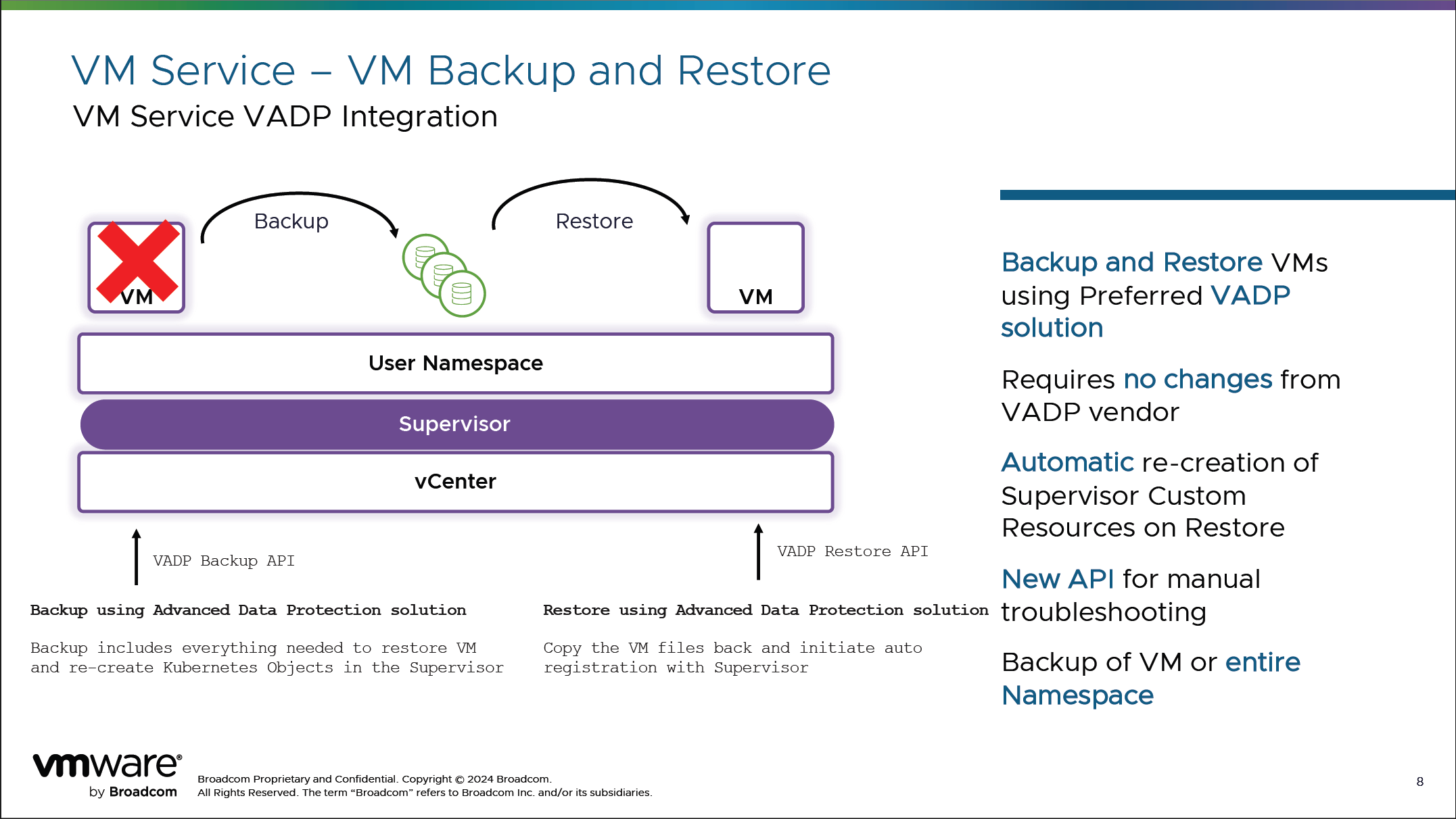 The VM service now includes the ability to backup and restore VMs that have been deployed using the VM service. It requires no changes to the backup tool. Backups can be down to the VM-level or the namespace. You would just reference the resource pool in vCenter.