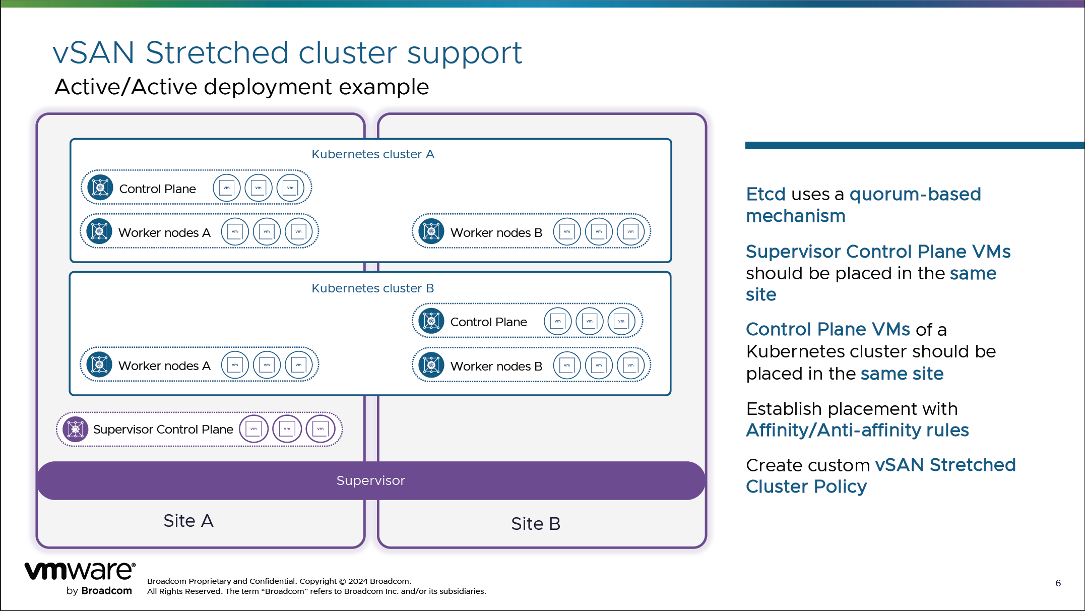 vSAN 8.0 update 3 now includes stretched cluster support for active/active deployments. It helps utilize affinity and anti-affinity rules to make sure that VMs are placed in the best way possible. This improves data availability and resilience across geographically dispersed sites.