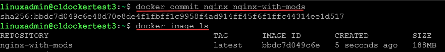 Below, we are capturing a running nginx container as a new container image. When we run the docker image ls command, we can see the newly created container image.