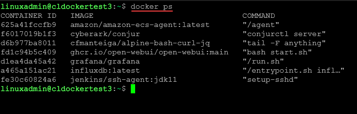 Below, we see all running containers on the Docker container host.