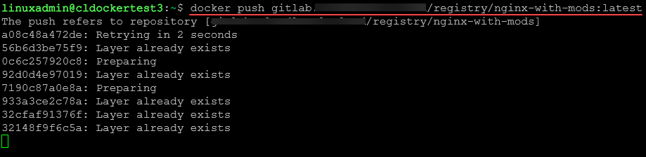 Below we are pushing an image from our local registry up to a self-hosted registry we are logged into.