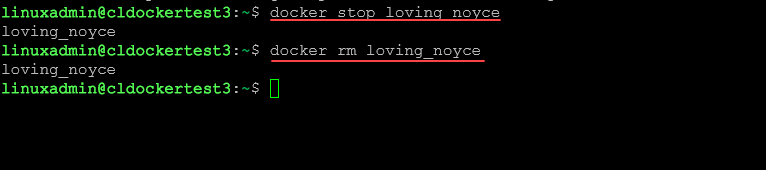 Below we are stopping a container first (required before you can remove) and then removing it using the docker rm command.