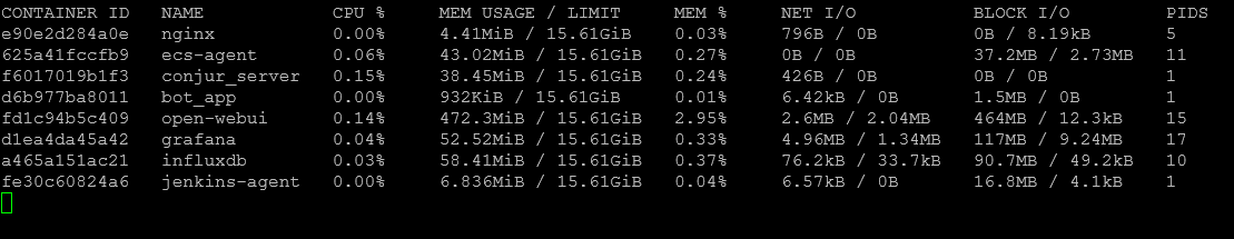 docker stats --no-stream # Show one-time stats snapshot