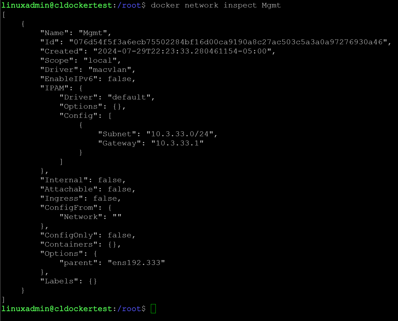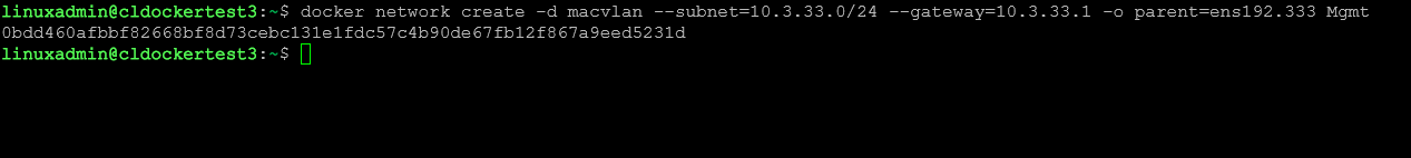 docker network create -d macvlan --subnet=10.3.33.0/24 --gateway=10.3.33.1 -o parent=ens192.333 Mgmt