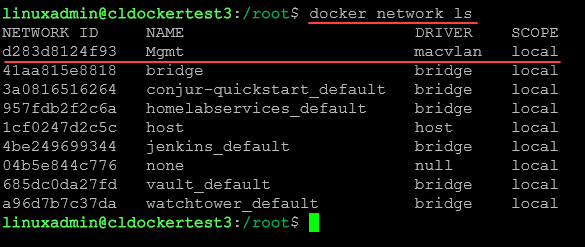 In the command we tell Docker to create the new network and specify we using the –driver macvlan option. You have to specify the subnet and gateway along with the parent interface (physical interface). The parent interface on my Ubuntu Server host is ens192. Here I am telling it we want to do 802.1q trunk mode since we are adding a VLAN tag. Finally, you tell it the name of the new macvlan. Here I am naming it Mgmt.