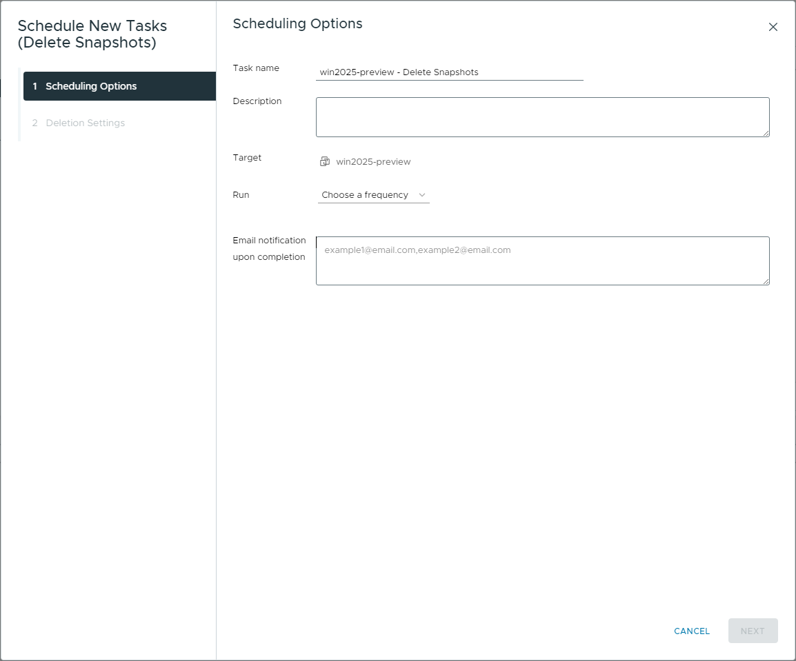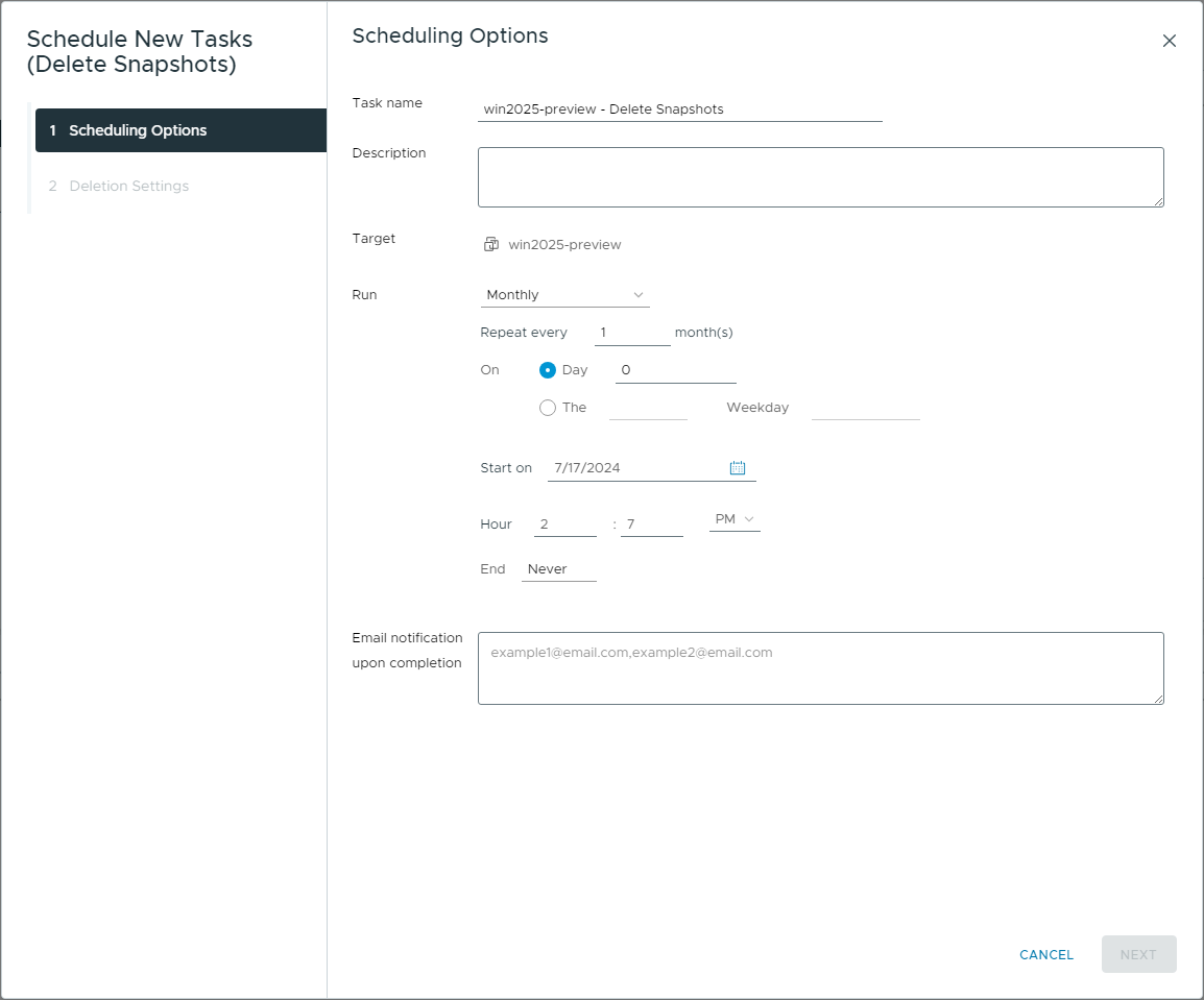 The Schedule New Tasks (Delete Snapshots) wizard will launch. Here you can configure the following:
