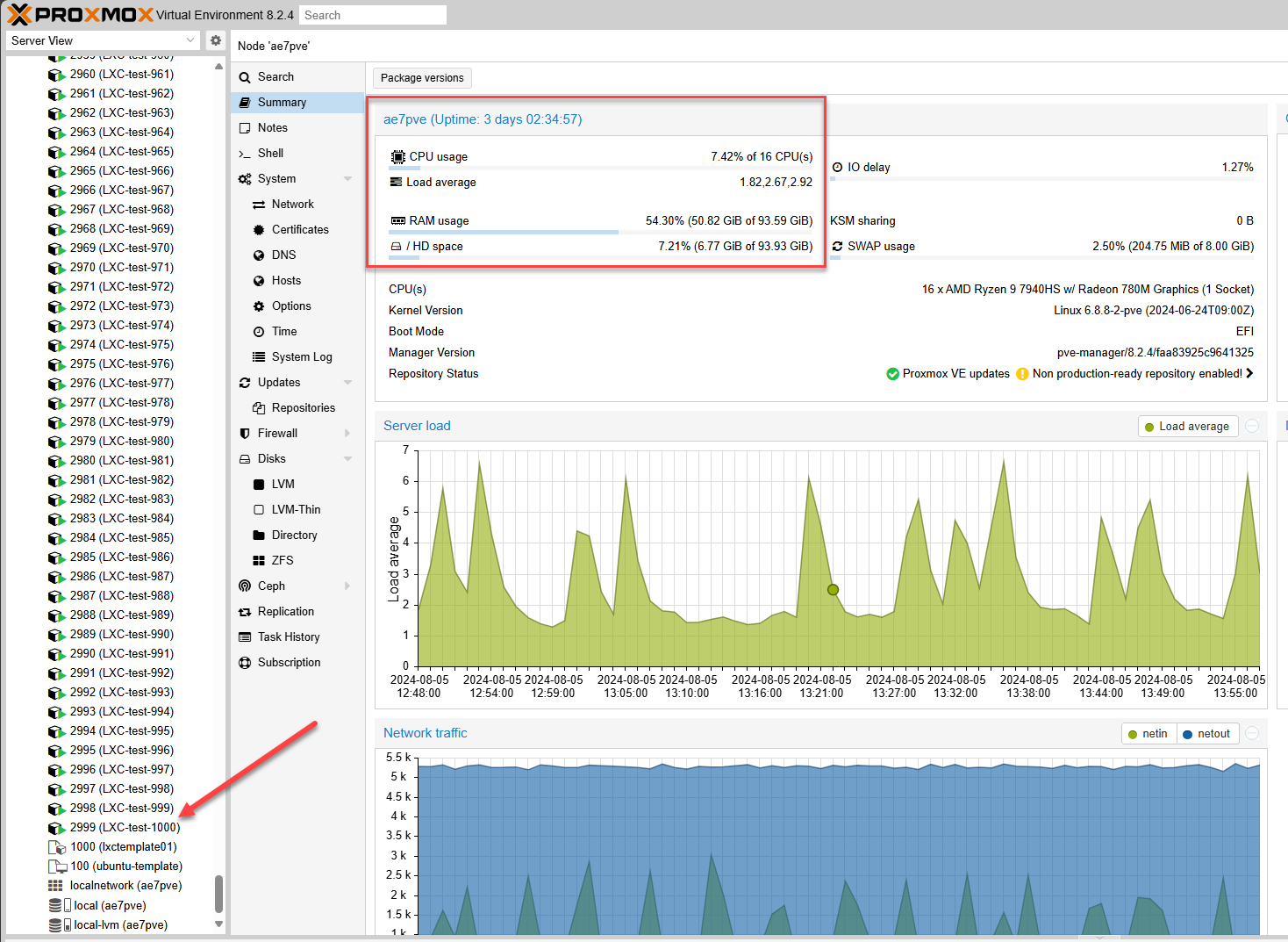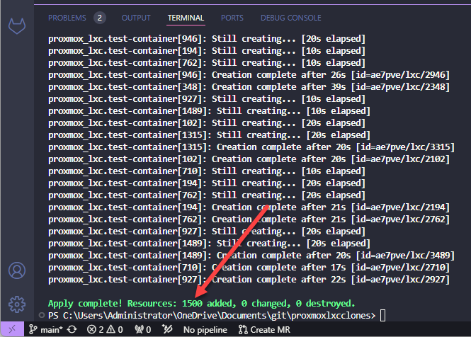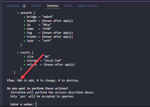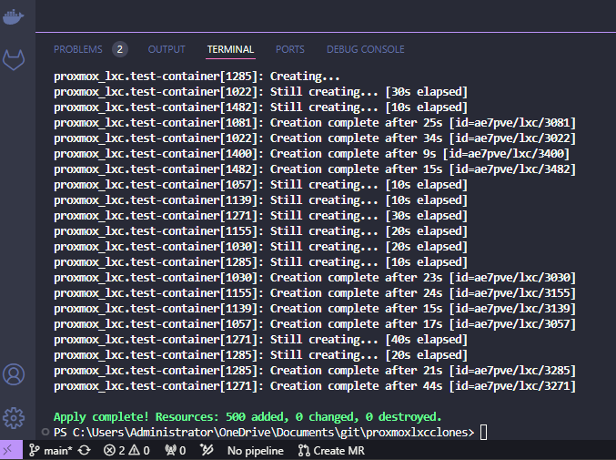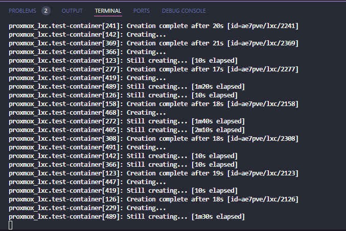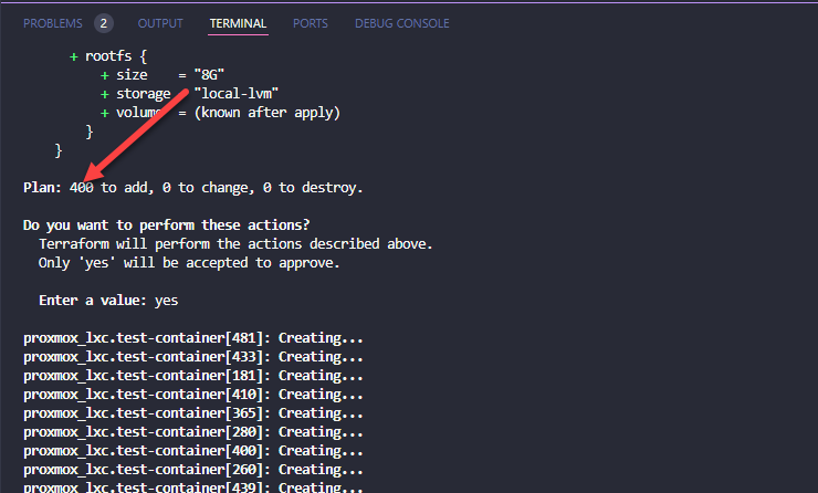 I had already started with 100 LXC containers, and the mini PC was not breathing hard at all. I decided to take it up several notches to a total of 500 containers. This meant Terraform would add 400 more to the environment.