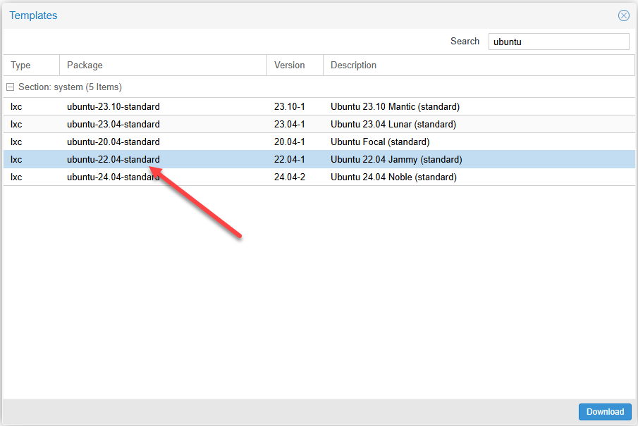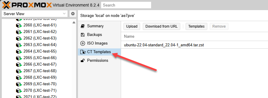 In Proxmox, you can go to your CT Templates menu in the Proxmox storage and click the Templates button.