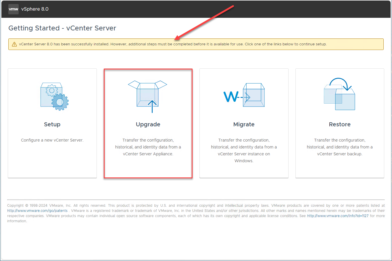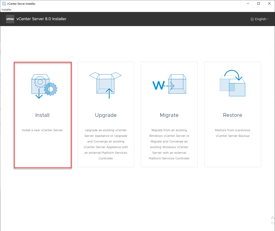 During the vCenter Server 8.0 Installer, don’t choose Upgrade, instead choose Install. Don’t worry, we will have the option to actually perform the Upgrade in just a bit.