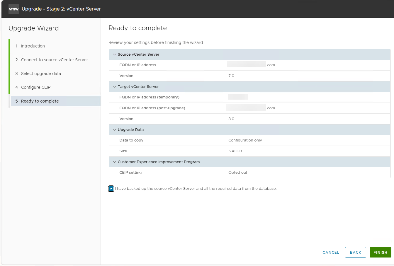 Now we are ready to complete the upgrade wizard. Click that you have backed up the source vCenter and click Finish.