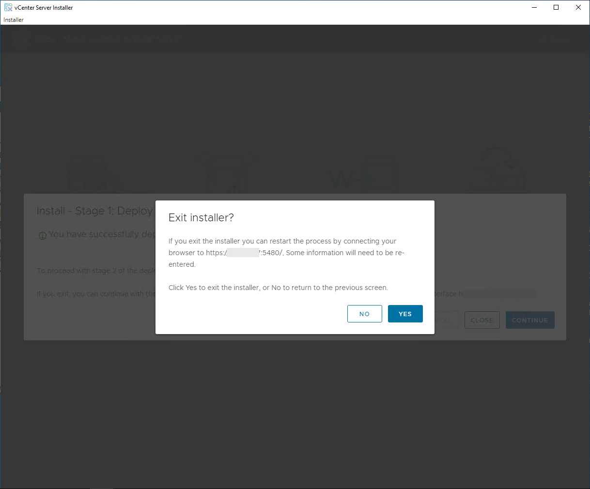 It will ask you if you are sure you want to exit the installer. We are, as Stage 1 has served the purpose of standing up a new VCSA appliance that we will now use to run an upgrade.