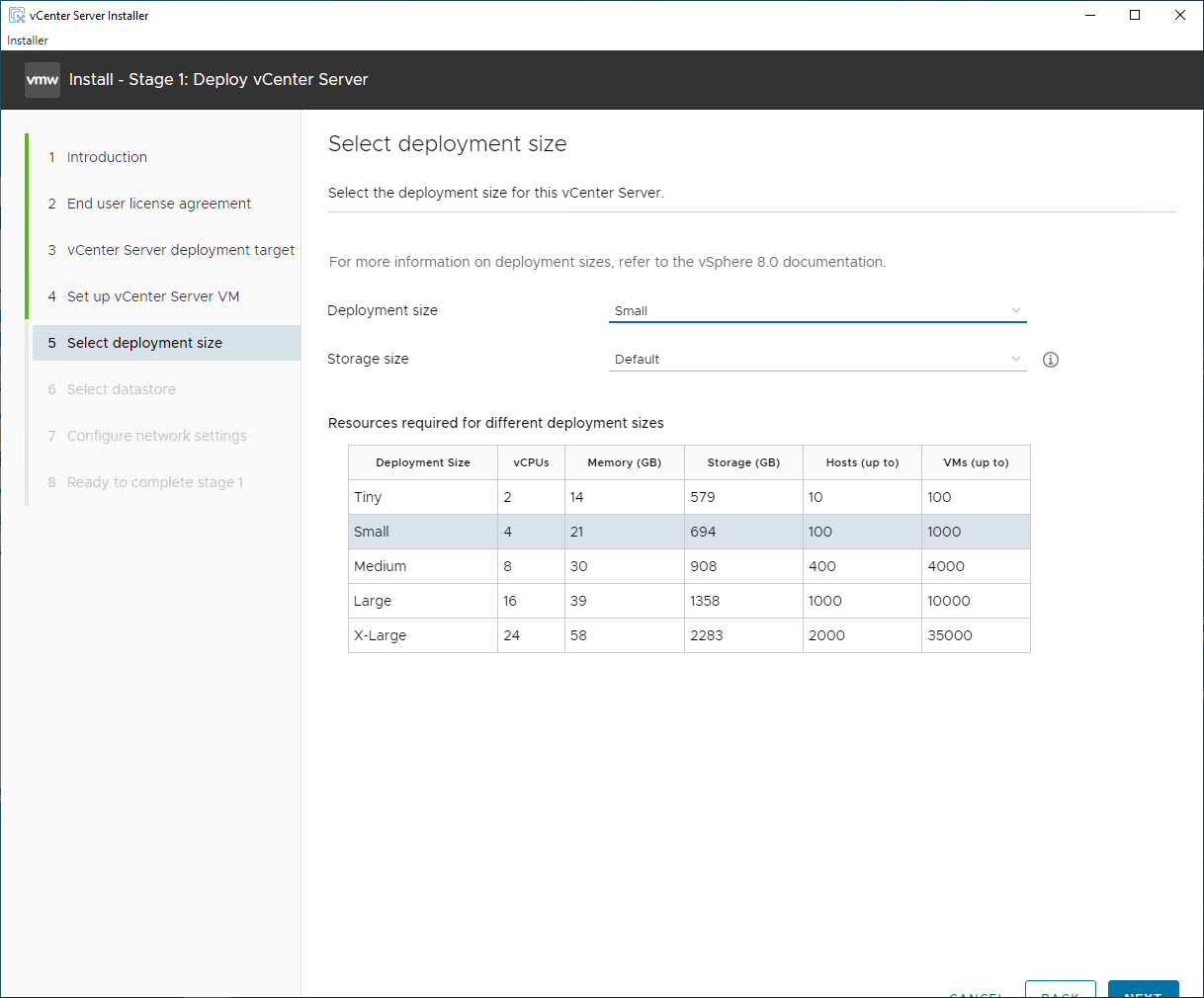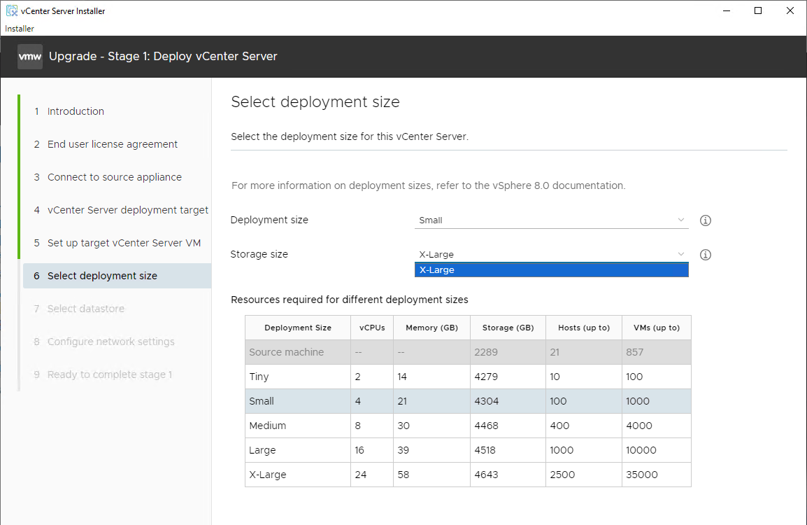 However, when running through the vCenter Server Installer wizard for the upgrade, I noticed the following on the 6 Select deployment size screen.