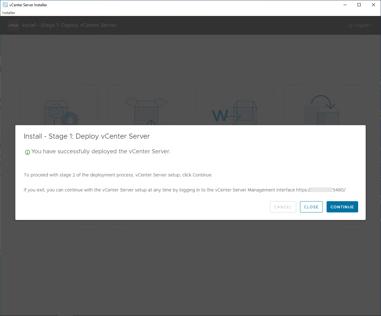 Finish out Stage 1 of the new install, and then click Close.
