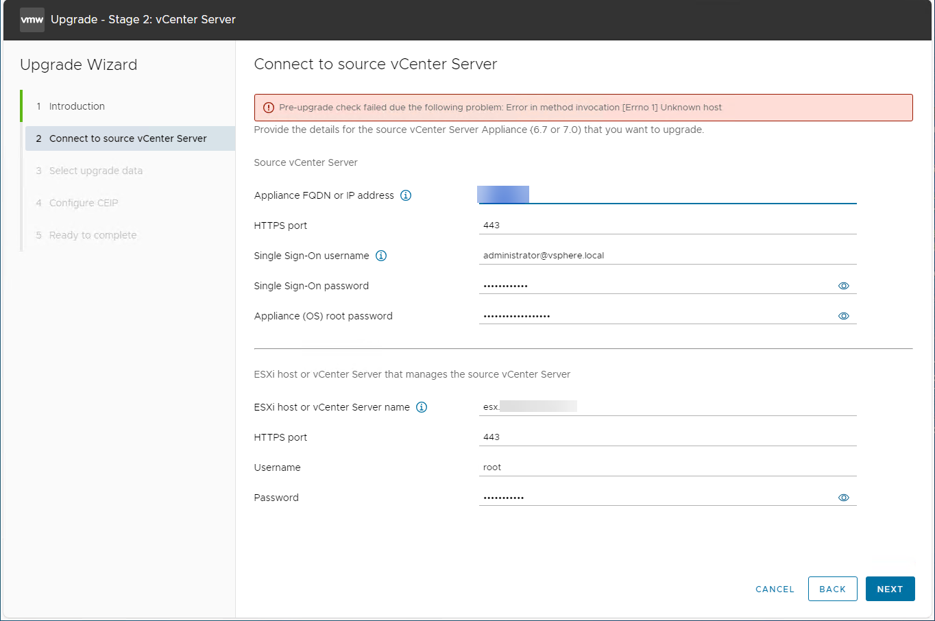 Note: Use the IP of Source VCenter instead of the FQDN because it may not resolve in the Network and the FQDN will be pointing to the source VCenter.
