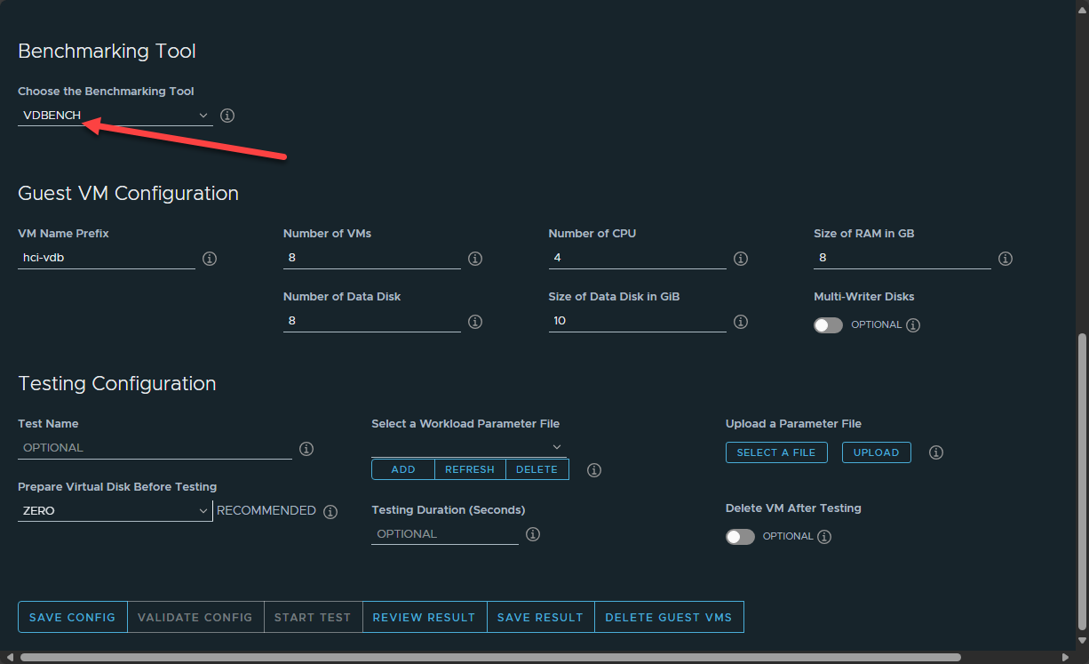 Below, when you are setting up your run, you can see you can choose vdbench under the “Choose the benchmarking tool.”