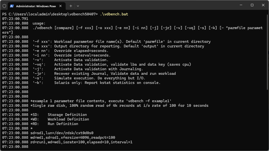 - Run Definition (RD) – this part controls the actual benchmark execution. It sets up the duration of the test, the type of workload, and how workloads and storage definitions are combined for the benchmark. It includes parameters like wd, iorate, elapsed, interval, warmup, etc. An example would be rd=run1,wd=wd1,iorate=max,elapsed=30m,interval=1s (This sets up a run (run1) where the workload wd1 is executed at the maximum I/O rate for 30 minutes with statistics gathered every second.)