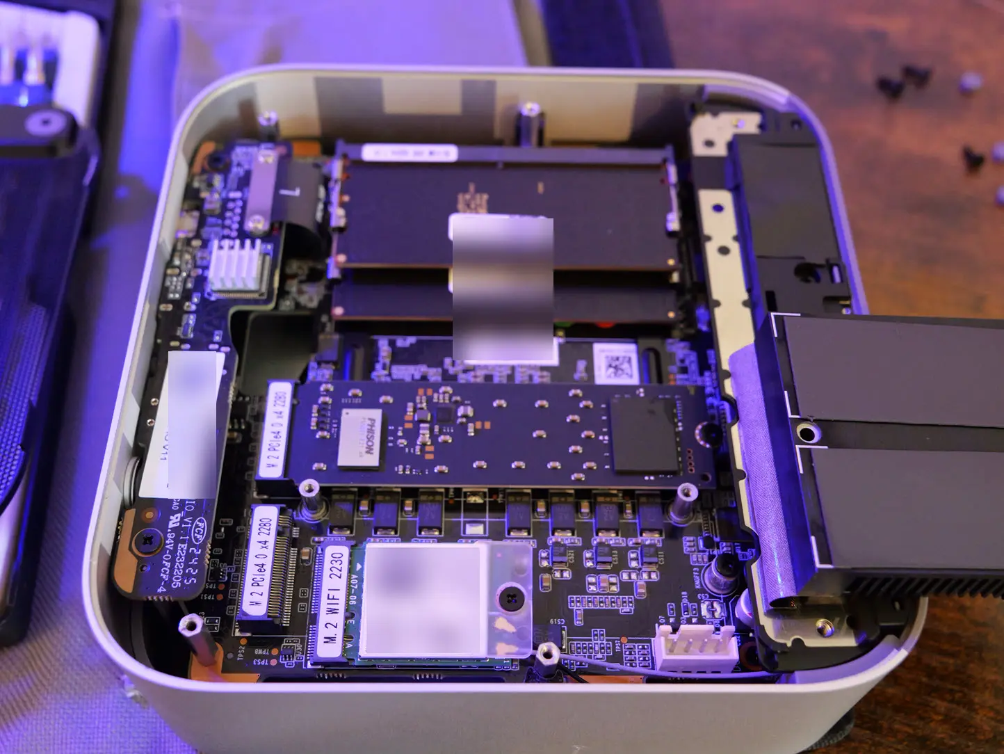 After removing the dust mesh plate, you have access to the (2) M.2 slots and RAM slots. The (2) M.2 slots are covered by the heatsink. To remove the heatsink, you remove (2) screws on each end of the heatsink.