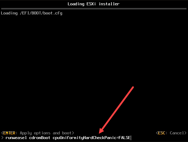 Once you install it, enter the above boot parameter one more time to get booted into your installed version of VMware ESXi. Then to make it permanent, use the command: