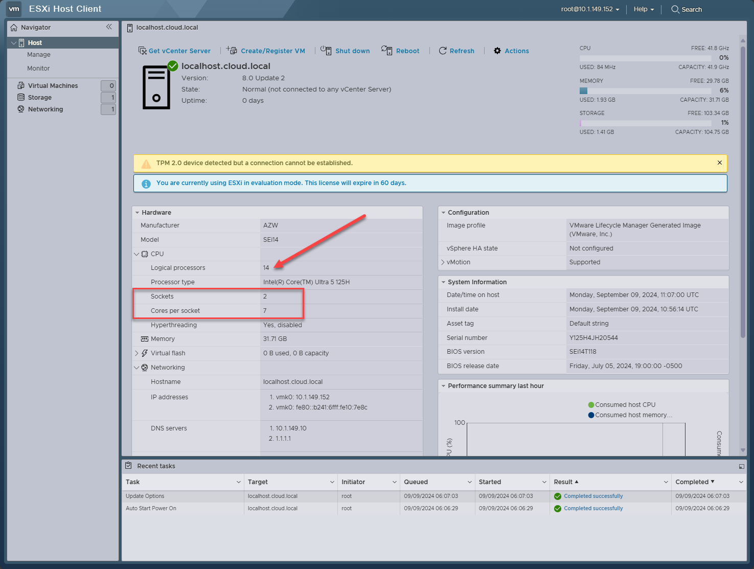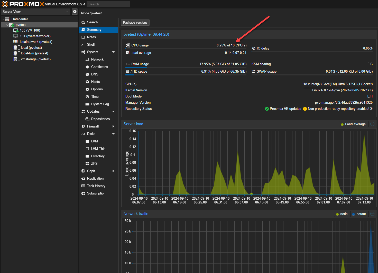 Proxmox works just fine and runs virtual machines and containers as you would expect, no issues there. You can see in the summary screen below the 18 CPUs showing in Proxmox.