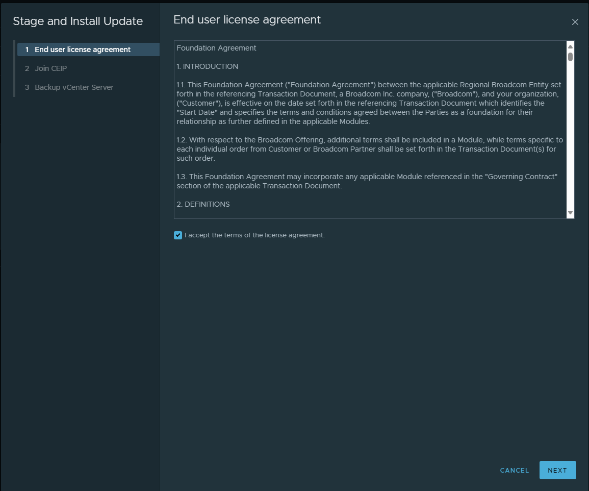 This will launch the Stage and Install Update wizard. First, we need to check the box to accept the EULA.