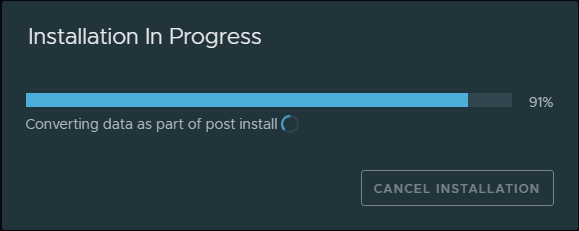 After a few minutes, in my home lab, I saw the process converting the data as part of the post install process.