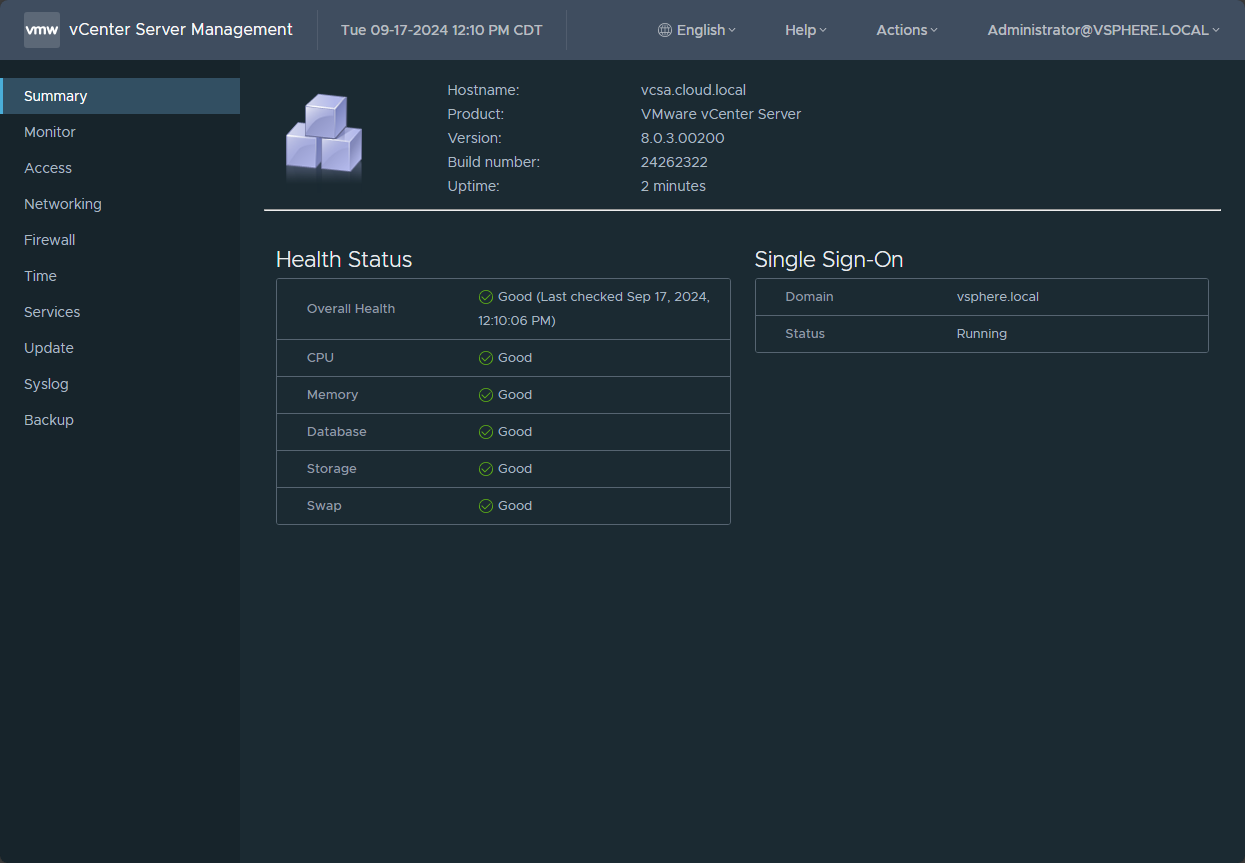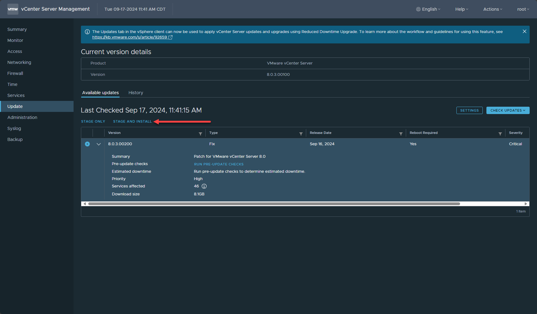 Be sure to check the version of vCenter in the VAMI interface after the update to make sure it shows the new 8.0.3.00200 version.