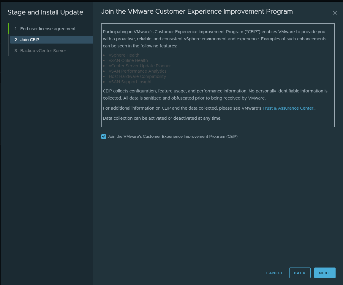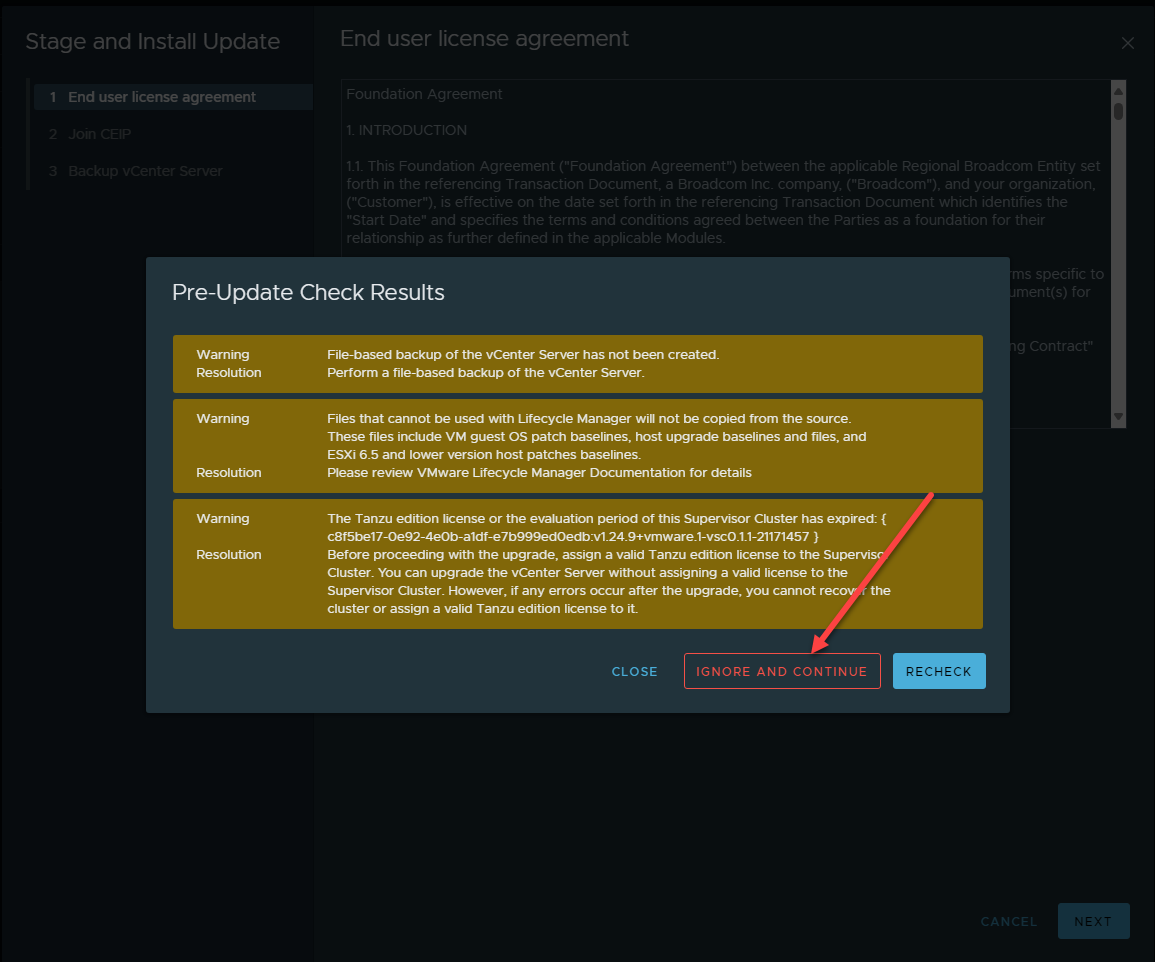 It will run a pre-update check on your vCenter Server. Note the findings and choose to proceed if applicable in your environment.