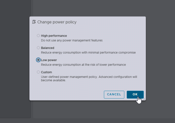 VMware ESXi has some easy settings that allow easily taking advantage of the C states configured in the BIOS. All we need to do is navigate in the host client to the Host > Manage > Hardware > Power Management > Change Policy if we want to change the policy.