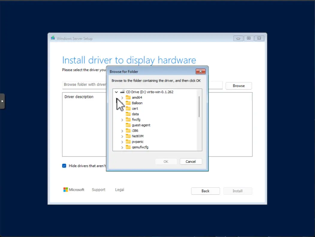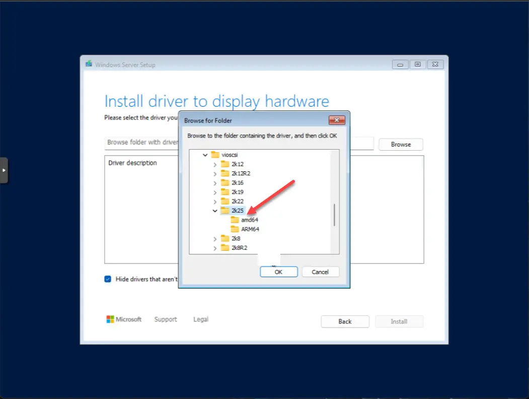 Scroll down to 2k25 folder and select the CPU architecture driver to load for your Windows VM.