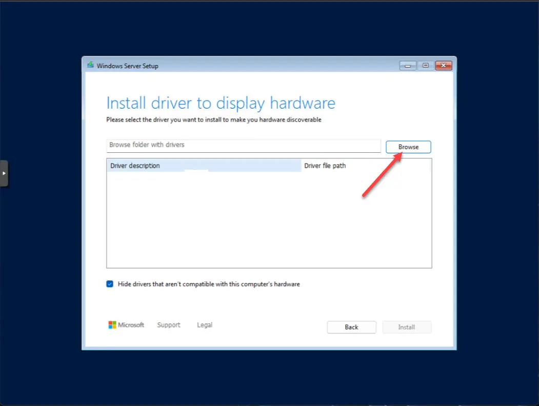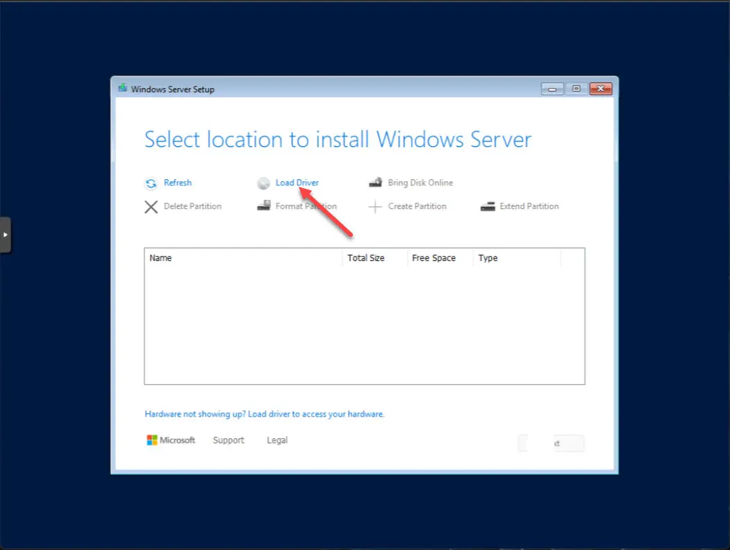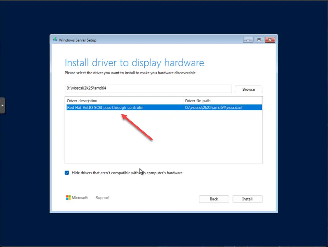 We will need to select the VirtIO storage driver during the install of Windows Server 2025. Click the Load Driver button.