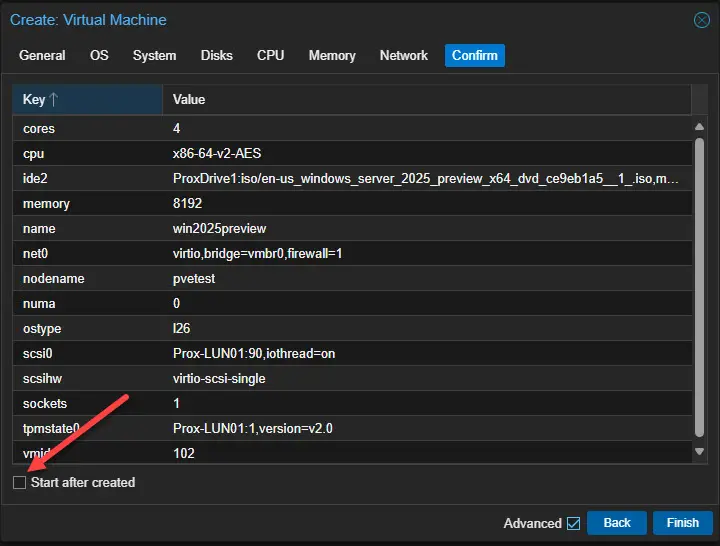 Confirm and finish the creation of the new Windows Server 2025 VM running in Proxmox.