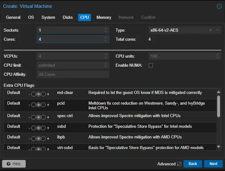 Next, on the CPU tab, configure the CPU sockets and cores configuration.