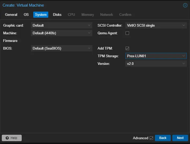 We can leave the defaults on the system tab. The important bit here is adding the TPM storage so we can encrypt the disk with Windows Server 2025.